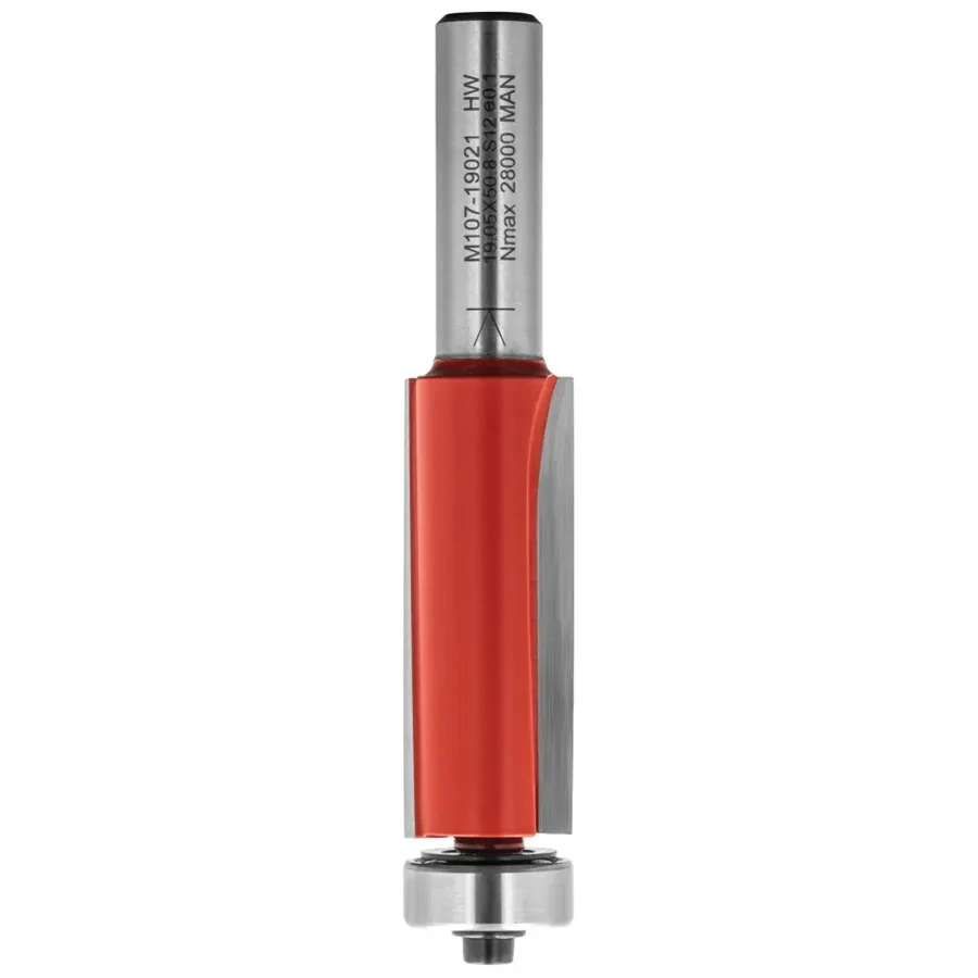 Ořezávací fréza M107 se dvěma šikmými zuby z tvrdokovu a kopírovacím ložiskem je určená pro ořezávání podél šablony upevněné pod obráběným materiálem, zejména pro frézování zakřivených tvarů. Lze použít pouze v ručních frézkách.