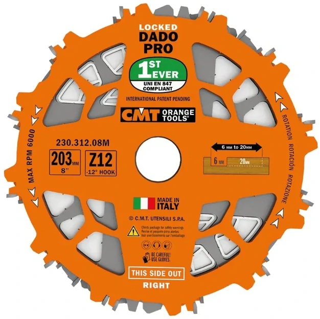 Unikátní sada CMT kotoučů Dado Pro je první Dado sada, která vyhovuje normě UNI EN847. Zatímco se Dado kotouče otáčí, jednotlivé prvky se nikdy nedostanou do vzájemného kontaktu, to je možné díky jedinečné konstrukci těl kotoučů a díky speciálním vymezovacím podložkám se zámky.