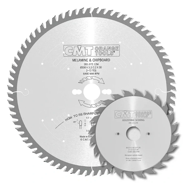 Nejlevnější sady kvalitních CMT kotoučů určené k dělení laminotřískových materiálů. Hlavní kotouč s trapézovým zubem a skládaný předřezový kotouč.