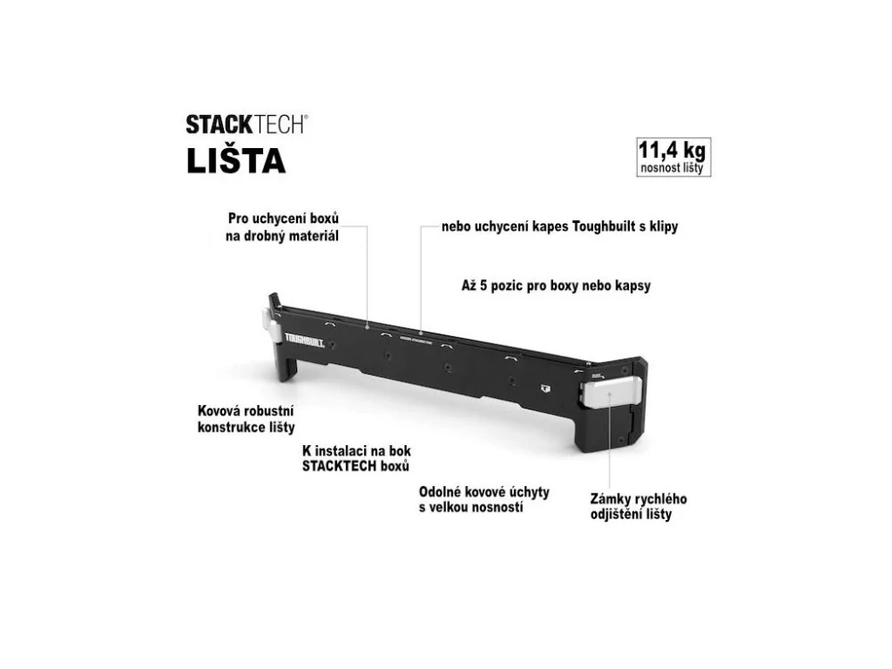 Upínací lišta systému StackTech® od ToughBuilt® propojuje oba systémy boxů a brašen ClipTech® do jednoho unikátního a funkčního celku.