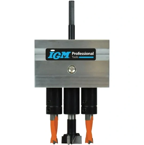 Revoluční vrtací přípravek se skládá ze stojanu a 8 typů vrtacích hlav, které lze na stojan namontovat. Můžete tak vrtat otvory pro závěsy Hettich, Blum, Mepla, Grass, FGV, pro malé závěsy 26mm, pro okenní kliky nebo použít hlavu s 5 vřeteny s roztečí 32mm pro vrtání děr pro kolíky či nosiče polic. Použití s ruční vrtačkou nebo na stojanových vrtačkách. Pro mazání použijte olej Mobil SHC100.